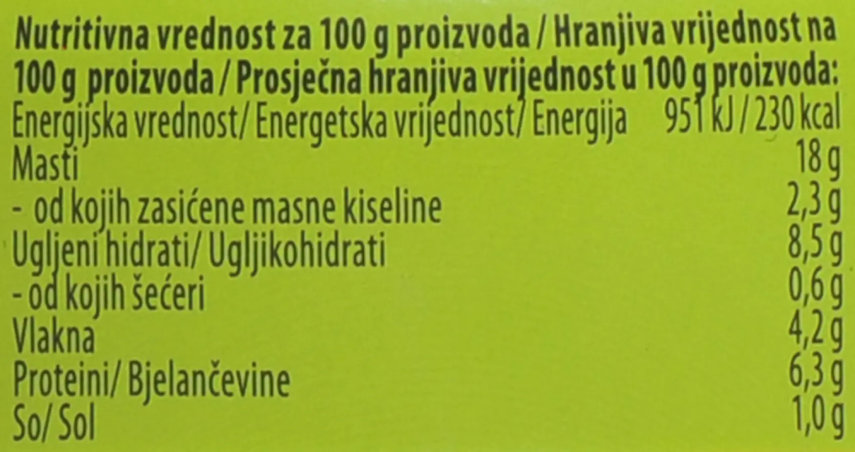 Kuhani slanutak 42 %, voda, biljno ulje (suncokretovo, repičino i sojino u promjenjivim udjelima), tahini (pasta od sezama) 7 %, ekstra djevičansko maslinovo ulje, sjeme sezama, koncentrat limunovog soka 1,5 %, sol, češnjak, čili paprika 0,2 %, bijeli papar, prirodna aroma limuna.