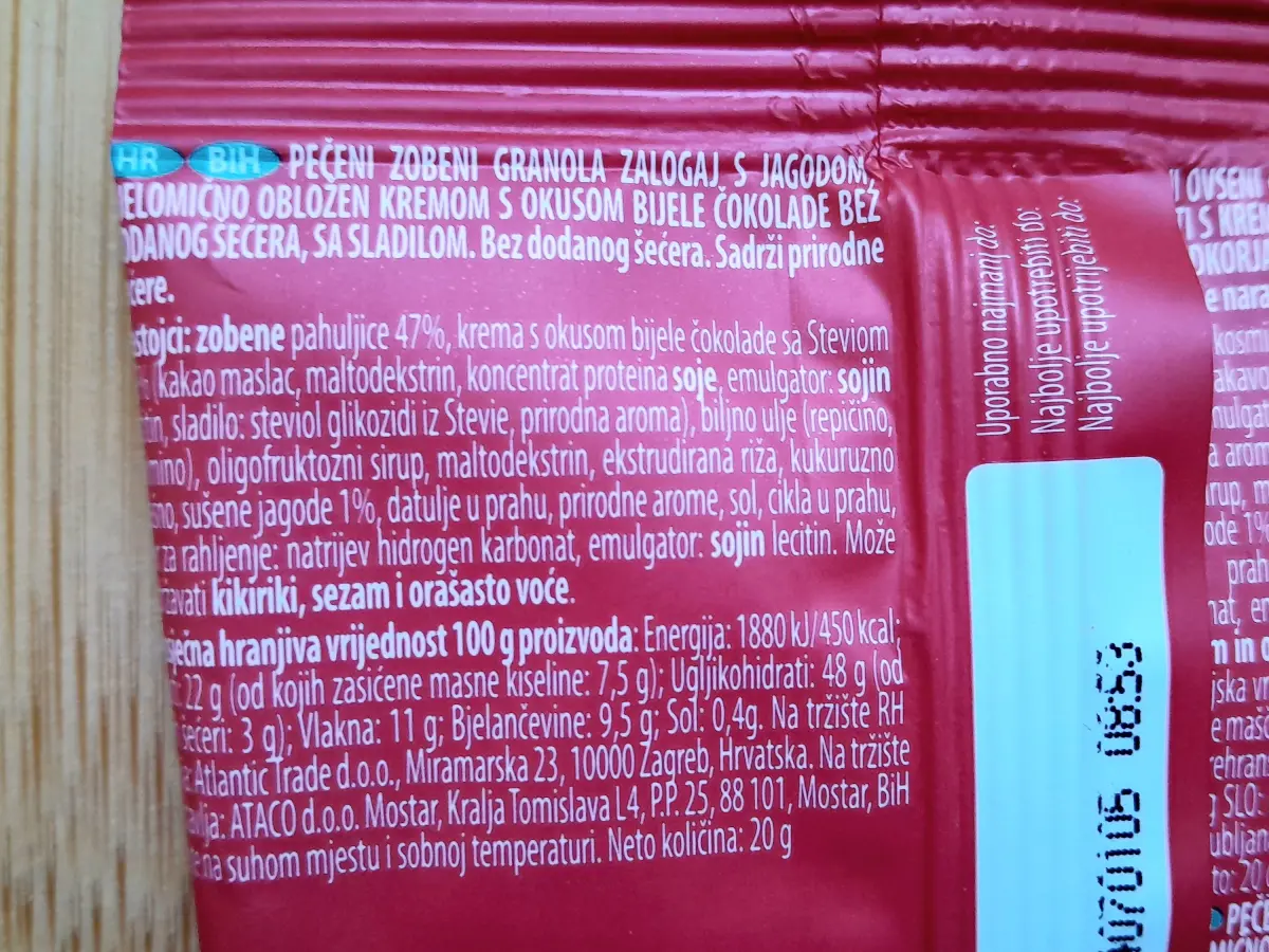 Pečeni zobeni granola zalogaj s jagodom, djelomično obložen kremom s okusom bijele čokolade bez dodanog šećera, sa sladilom.